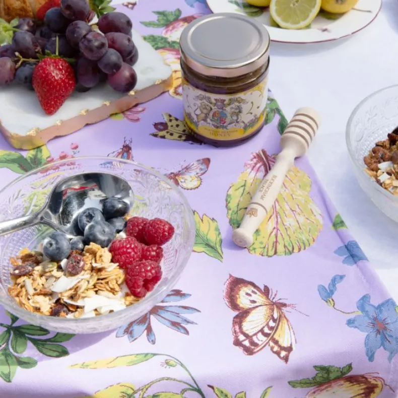 This Lilac Cotton Tea Towel Is Printed With Range Of Leaves, Insects And Flowers.